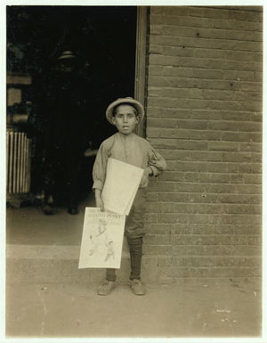 Newsboys and newsgirl. (Mary Malchade) (9 years old.) Getting afternoon papers, Park Row. Location: New York, New York (State)