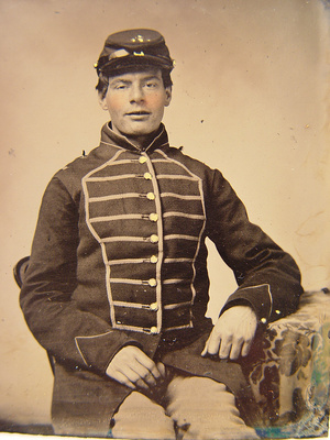 Unidentified soldier in Union musician uniform and two belts with cavalry saber