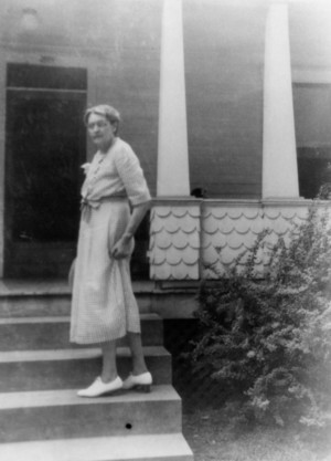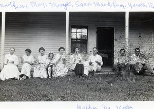 Group picture of Orville Wright, Bishop Milton Wright, Katharine Wright, Earl N. Findley, nephew Horace Wright, John R. McMahon, and Pliny Williamson, on the porch of Orville's home, Hawthorn Hill; Dayton, Ohio