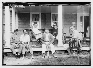 K.M. Murchinson, W.C. Morrow, W. Poor, P.S.B. Randolph, sitting on porch, with tennis racquets