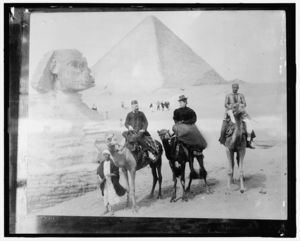 Couple on camels in front of the Sphinx and pyramid of Jizah, Egypt