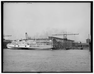 Baltimore, Maryland. Workers arriving at the Bethlehem Fairfield shipyard by a former pleasure boat of the Wilson Line, now used as a workers' transport