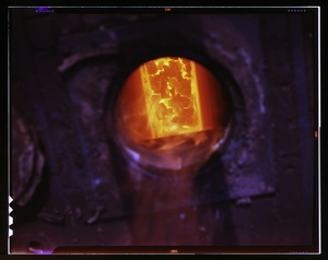 A scene in a steel mill, Republic Steel, Youngstown, Ohio. Molten iron is blown in an Eastern Bessemer converter to change it to steel for war essentials