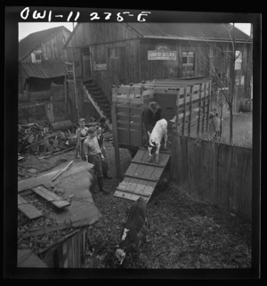 Lititz, Pennsylvania. Unloading calves and pig purchased at the union stockyards in Lancaster at Lutz's slaughterhouse