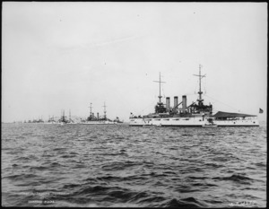 Ohio (BB12). 1st and 2d squadrons at Hampton Roads, Ohio port beam at right, 06-12-1907 -