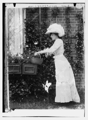Mrs. J. Brown Potter, with basket at window garden