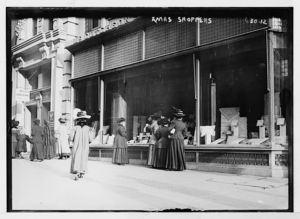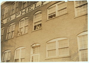 Workers in Fargo & Phelps Shoe Co., Saw six boys and two girls probably under 14. Note face of very young girl in window. Large sign up, "Boys Wanted." Location: Louisiana, Missouri.