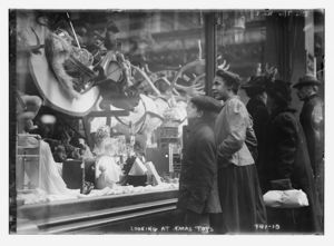 Woman and young boy looking at window of shop where Xmas toys are displayed