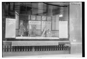 E.J. Crane, watchmaker and jewelry store with man working in window and man standing in doorway, Richmond, Virginia