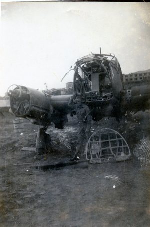 Carl Birdwhistell posing with downed German plane in 1944 in Italy during World War II.