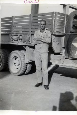 Carl posing with his Quartermaster Service truck, likely in 1943 in Africa.