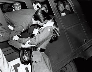 Soldier kissing a Red Cross Nurse as He Heads Home, 1945